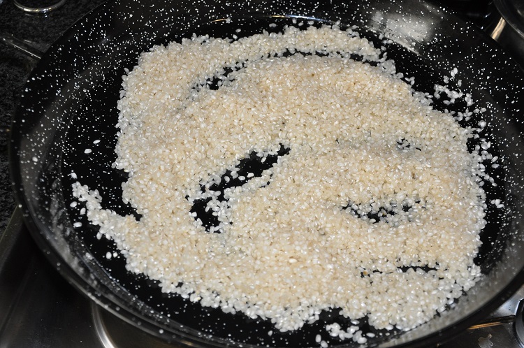 10. Echar el arroz y rehogarlo con todo el sofrito resultante para que se impregne de todos los sabores