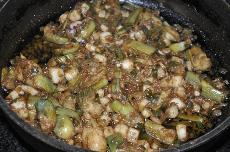 5. Cortar las alcachofas en 8 trozos, dorar, salar y reservar